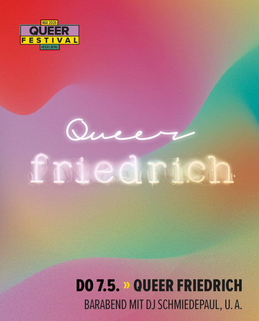 You know you want it. And Heidelberg needs it! Heidelberg’s Friedrich bar turns into Queer Friedrich! Starting at 8:00 pm, you can enjoy the best in queer listenings with a fine selection of DJ*s and some very special guests. Why not come along and take a listen? While you try the gourmet snacks and drinks, some interesting extra attractions await to surprise you. Tell your friends, help to inspire Heidelberg’s queer nightlife, and experience an evening to remember!